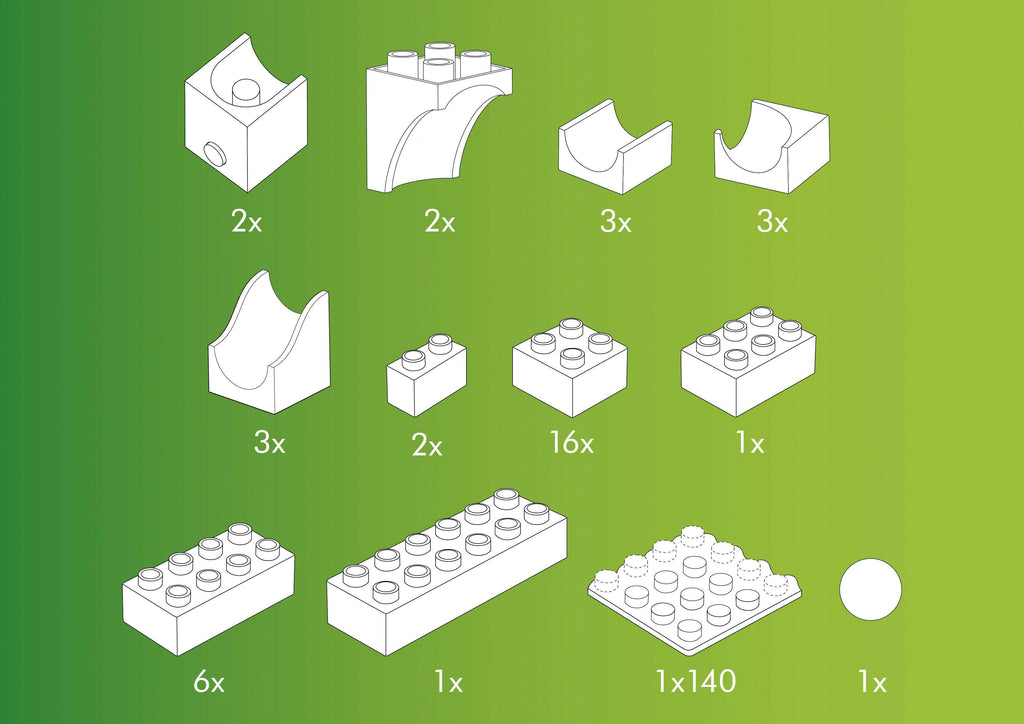 A complete stand alone set or can be used to expand on existing run elements. A button operated catapult and a deflector to guide your marbles right where you want them. Push the button and watch the ball fly up and defy gravity.